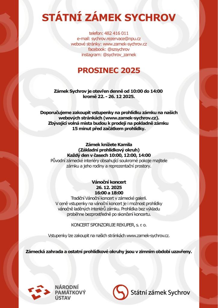 Státní zámek Sychrov - kulturní přehled - prosinec 2025 Zámek Sychrov je otevřen denně od 10:00 do 14:00 kromě 22. - 26.12.2025.